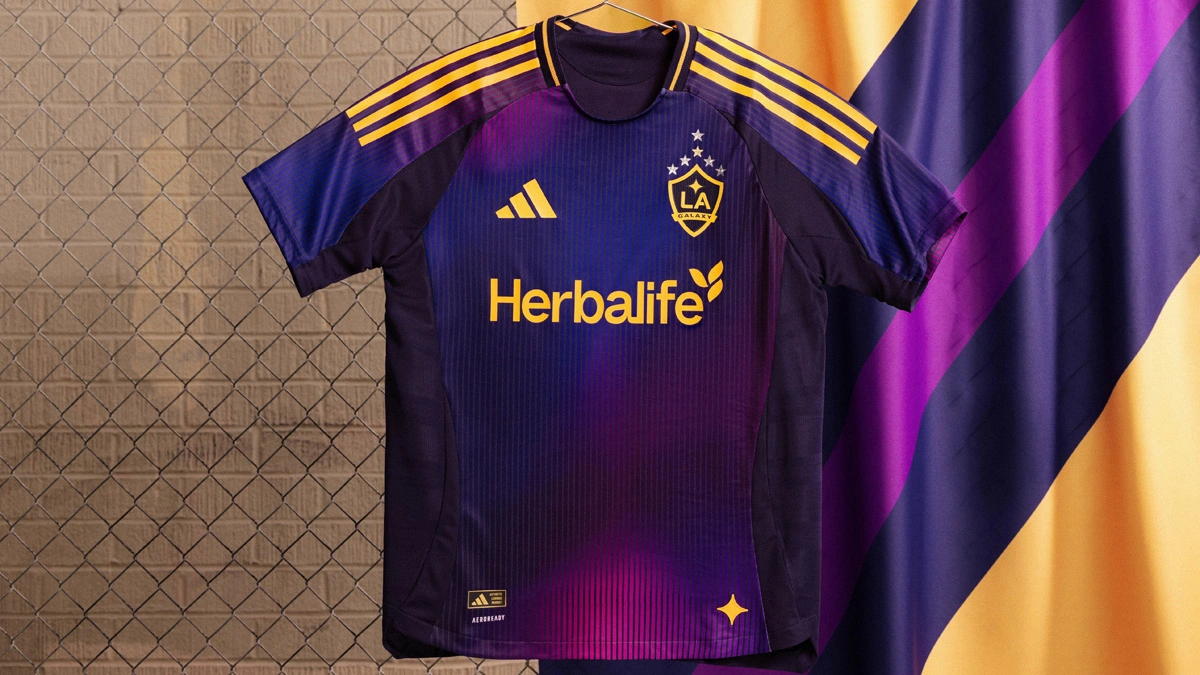 A Galaxy supporter jersey with LA sunset vibes, made with recycled materials.